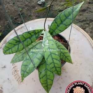 Hoya from Kalimantan, Indonesia. This Hoya is a mutation of the Hoya Callistophylla sp Kalimantan variant. Its dark green leaves form a fine grain pattern and narrow, elongated leaves. The flowers are similar to those of most Hoya callistophylla varieties, and this species is considered rare in its natural habitat.